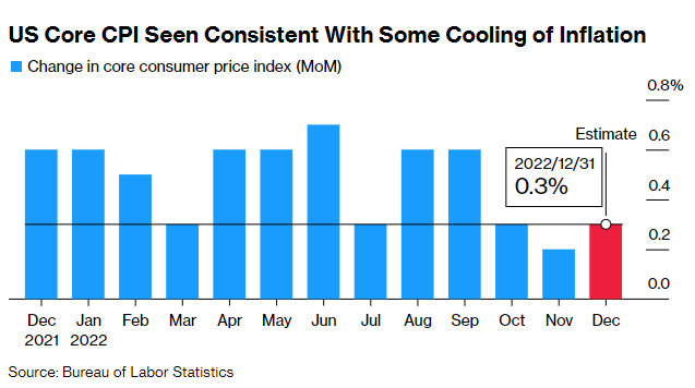 剔除了波动较大的食品和能源成分的核心CPI方面,彭博分析师预计12月份核心CPI将同比增长5.7%,环比上涨0.3%。若核心通胀环比上涨0.3%,这一预测数据虽然略高于11月,但月度涨幅将与本季度的平均水平一致,并且远低于1月至9月的平均0.5%的水平。