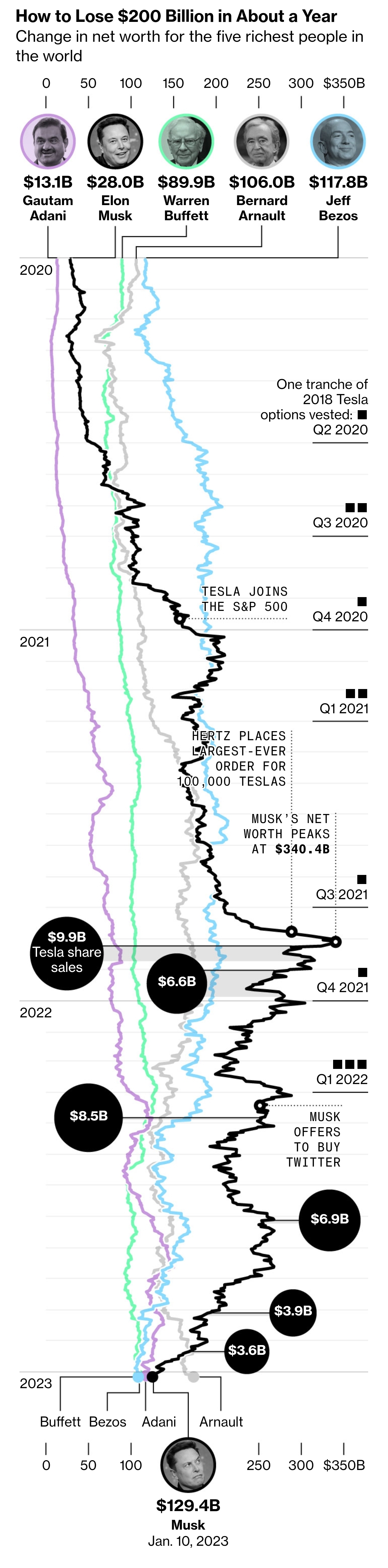 由于特斯拉面临激烈竞争,加之降价后的交付量仍未达到预期,导致该股自12月1日以来累计下跌39%。同期,以科技股为主的纳斯达克100指数跌幅仅为特斯拉的五分之一。而多年以来一直通过保证金贷款为自己筹集资金的马斯克,也很自然地丢掉了世界首富的宝座。根据彭博亿万富豪指数,马斯克目前的净资产约为1294亿美元,较巅峰时期缩水逾2100亿美元。