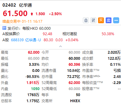 亿华通港股每股发售价60港元,较今日其A股收盘价折价35.23%,公开发售获0.29倍认购,一手中签率100%,国际配售获1.84倍认购。