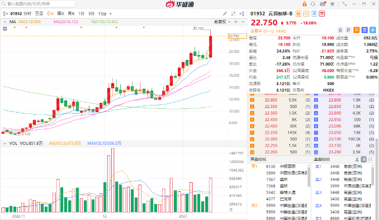 1月21日消息,云顶新耀-B(01952.HK)四连跌守稳10天线(18.83港元),今天重拾升势,午后急涨23%股价高见23.7港元创半年高。现报22.75港元每股,涨19.86,成交增至832万股,创近半个月高。