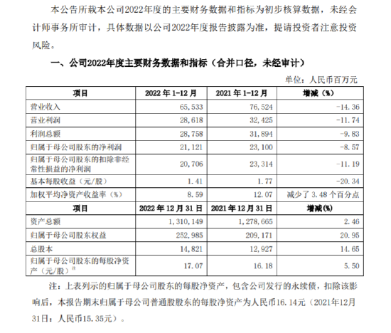 中信证券披露业绩快报称,2022年净利润211.21亿元,同比下降8.57%,营收655.33亿元,同比下降14.36%。