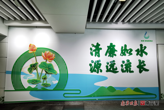 “南湖·绿城清风站”廉政文化主题车站以“清廉之水润绿城”之意为设计理念,寓意深刻。水韵廉洁,清廉如水,廉政文化主题车站以深挖更加贴近市民生活的清廉文化浸润南宁市民的心田。