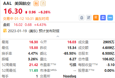 美国航空 $AAL 涨超6%,报16.3美元,总市值106亿美元,股价创逾7个月新高。美国航空预计Q4营收增长16-17%,超此前指引的11-13%;调整后每股盈余1.12-1.17美元,远超预期的0.6美元和此前指引的0.5-0.7美元。
