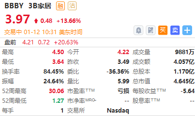 3B家居 $BBBY 涨超13%,据彭博此前报道,知情人士透露,3B家居已开始准备破产申请,可能在今年第一个营业季度提交。