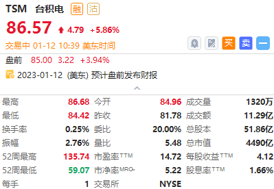 台积电 $TSM 涨超5%,公司Q4收入同比增长42.8%至6225.3亿元新台币(合204.2亿美元);净利润达到创纪录的2959亿元新台币(合97.2亿美元),高于分析师预计的2894.4亿元新台币。