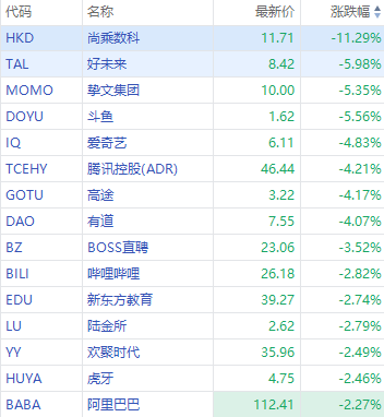 华盛资讯1月12日消息,热门中概股集体下跌,尚乘数科跌超11%,知乎跌超7%,好未来跌超5%,爱奇艺跌超4%,腾讯ADR跌超4%,Boss直聘跌超3%,阿里巴巴、哔哩哔哩跌超2%。