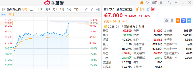 1月13日讯,新东方在线午后持续走高,股价涨超11%,据银柿财经,从接近春晚直播项目人士处获悉,春晚主会场直播的合作方将是新东方在线旗下东方甄选,该公司签约主播董宇辉已经在彩排。此外,有部分遥望科技的签约明星,将会在直播会场出镜。