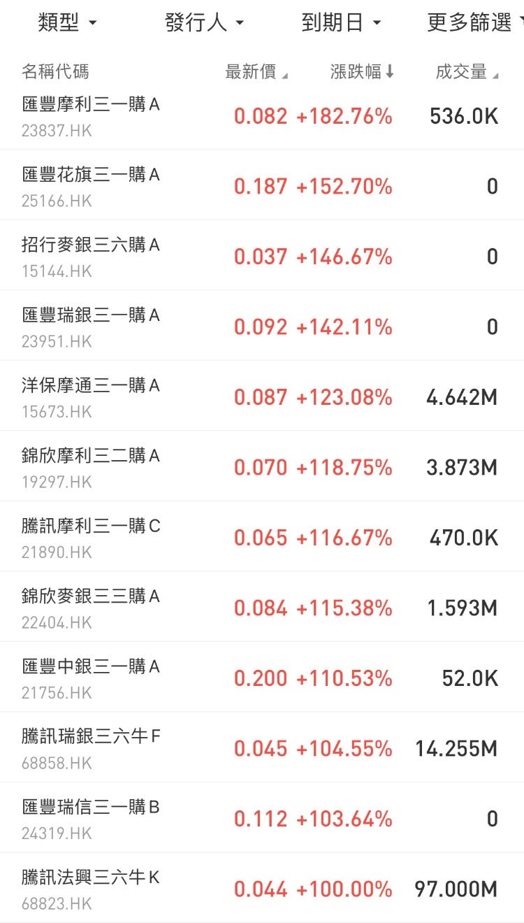 在今日涨幅榜中,汇丰摩利三一购A $23837.HK 涨182.76%;此外,洋保摩通三一购A $15673.HK 涨123.08%,锦欣摩利三二购A $19297.HK 涨118.75%。