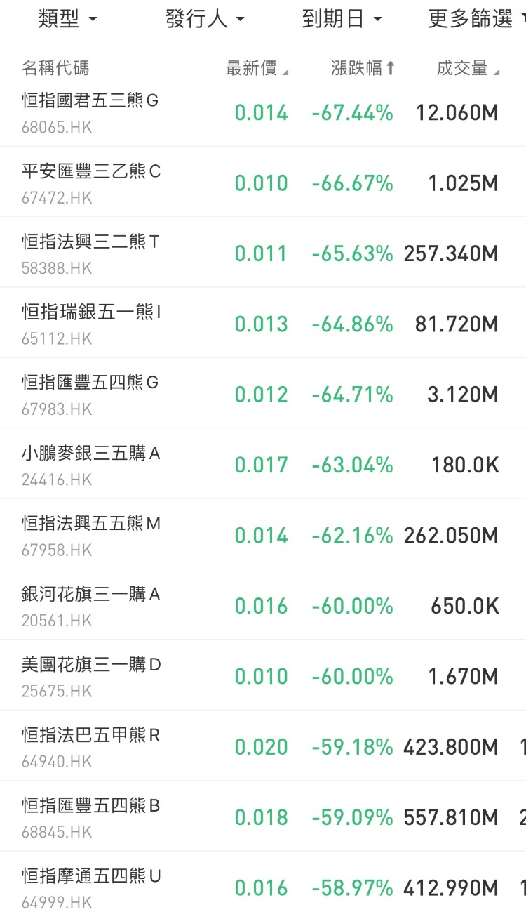 在今日跌幅榜中,恒指国君五三熊G $68065.HK 跌67.44%,平安汇丰三乙熊C $67472.HK 跌66.67%。