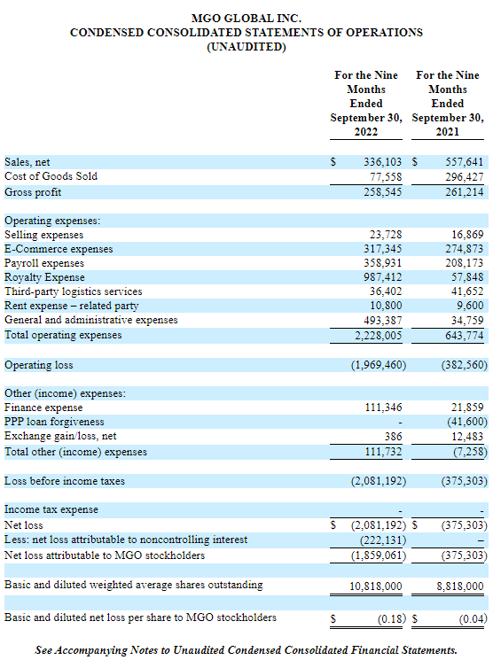 MGO Global招股书显示,在截至2022年9月30日的前9个月、2021年9月30日的前9个月内,公司分别实现销售额33.6万美元、55.8万美元,运营损失196.9万美元、38.3万美元,净损失208.1万美元、37.5万美元。