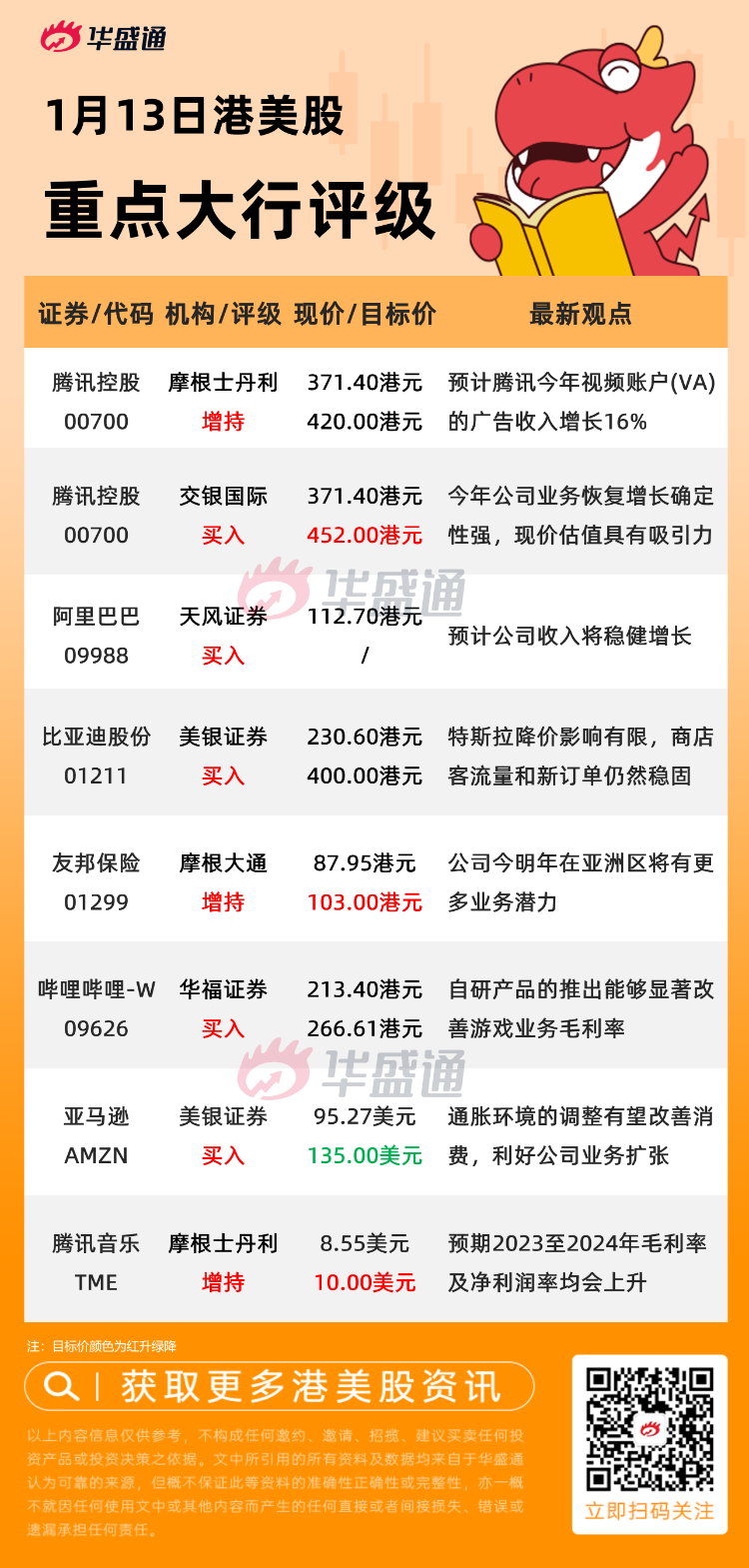 摩根士丹利发表报告指,投资者对腾讯今年网游业务前景转趋乐观,并对其新游戏毛利潜力相当感兴趣。该行重申对腾讯“增持”评级,目标价420港元。该行指,投资者对腾讯游戏今年的增长潜力信心加大。腾讯去年游戏业务增长乏力为市场重点关注因素,但自去年11月以来出现两个拐点催化剂,包括去年11月和12月的总收入提高,以及获得多个关键IP游戏授权。大摩预测,腾讯今年的游戏总收入将按年增长10%,其中内地游戏收入按年增长5%,海外游戏收入按年增长22%。另外,该行预计腾讯今年视频账户(VA)的广告收入增长16%。