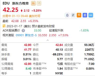 新东方教育涨逾5%,现报42.25美元。有消息称,春晚主会场直播的合作方将是新东方在线旗下东方甄选。