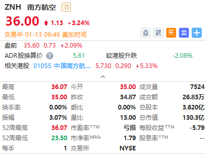南方航空涨超3%,现报36美元,公司此前公告,拟将美国存托股份从纽约证券交易所退市。