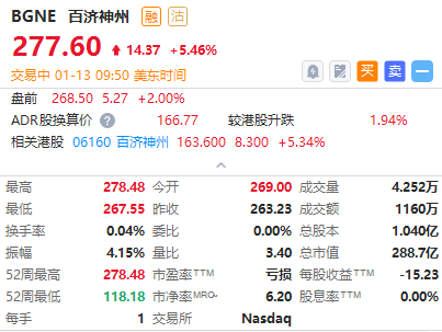 百济神州涨超5%,现报277.6美元,公司联合创始人、董事长兼首席执行官欧雷强日前表示,公司开发的多个创新药已在2023年以前进入临床阶段。