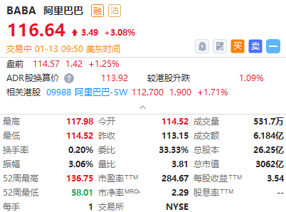 阿里巴巴涨超3%,现报116.64美元。此前,央行表示蚂蚁集团等14家平台企业金融业务的大多数问题已基本完成整改。