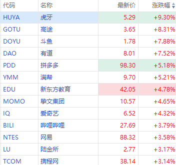 其他中概股,虎牙涨超9%,高途涨超8%,有道涨超7%,拼多多、满帮涨超5%,爱奇艺、挚文集团涨超4%,网易、哔哩哔哩、携程网涨超3%。