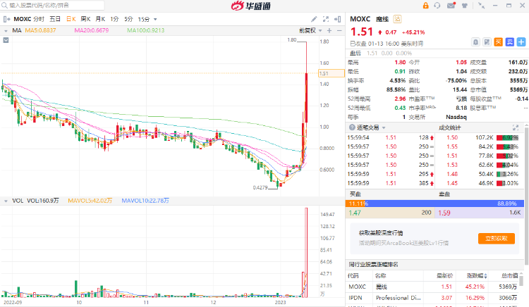 只用了两个交易日,魔线股价就从0.60美元,飙涨到1.51美元,股价涨了约1.52倍。