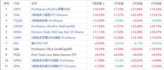 股指ETF方面,本周涨幅居首的是ProShares UltraPro罗素2000 $URTY ,全周收涨16.54%。第二名仍是做多小盘股ETF,为3倍做多小型股ETF $TNA ,周涨幅达16.30%。此外,3倍做多纳指ETF $TQQQ 以及3倍做多标普500指数ETF $UPRO 、 $SPXL 亦位居涨幅榜前列,对应涨幅分别为13.95%、7.98%和7.95%。