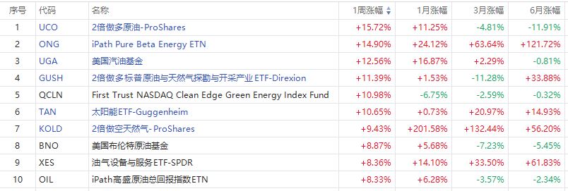 能源ETF方面,做多类ETF多数涨幅居前。位居首位的是2倍做多原油ETF $UCO 。另有1只做空类ETF上榜前十——2倍做空天然气ETF $KOLD ,该ETF周涨幅达9.43%。
