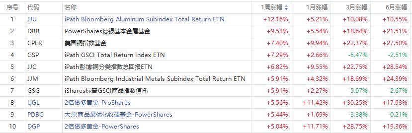商品ETF方面,本周做多金属相关ETF的涨幅居前。其中位居涨幅榜第一的是铝相关ETF $JJU ,周涨幅达12.16%。做多黄金相关ETF(如 $UGL 、 $DGP )也表现不错。