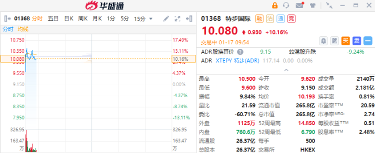 特步国际此前表示,今年春节流水零售按年增20%。截至发稿,该股涨10.16%,报10.108港元,暂成交2.18亿港元。