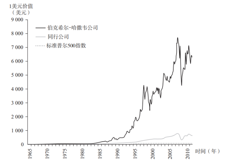 我们来看看这些云泥之别的数字。从1965年6月巴菲特接管伯克希尔-哈撒韦公司到2011年,公司股价实现了惊人的年化20.7%的复合增长率,使得同期标准普尔500指数年化9.3%的回报率相形见绌。