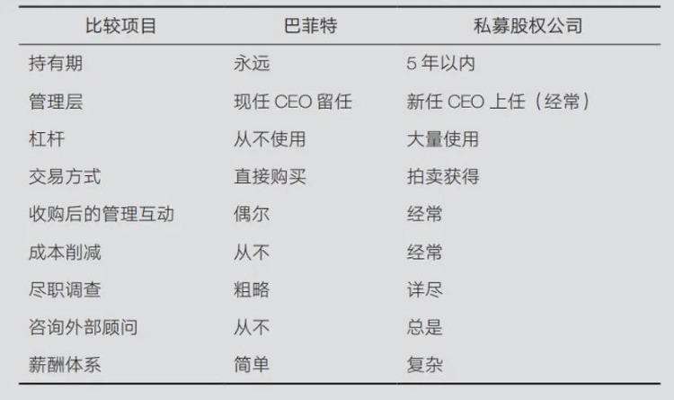 针对收购,巴菲特自创了一套举世无双的方法体系。下表将该方法体系与传统的私募股权公司的方法进行了比较。