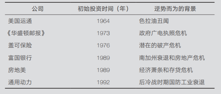 当格雷厄姆的“市场先生”抑郁到极点之时,巴菲特却在稳步地大举买入。伯克希尔-哈撒韦公司在公开市场主要的大笔投资都以某种行业或公司危机为契机,这些危机掩盖了有巨大潜力的公司业务的价值,下表表明了这一点。