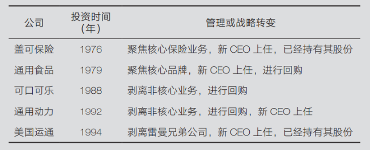 20世纪90年代初,巴菲特继续在公开市场对精选标的进行大额投资,他持股较多的有富国银行(1990年)、通用动力公司(1992年)和美国运通公司(1994年)。