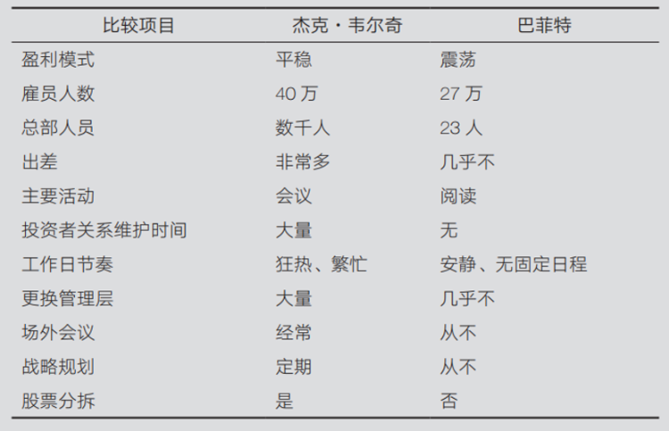 杰克·韦尔奇在通用电气推行的体系风风火火,它强调集权的战略举措,强调CEO轮换制以及马不停蹄的出差和会议节奏。尽管巴菲特非常钦佩杰克·韦尔奇的能力,但是他们管理风格的反差极富戏剧性。