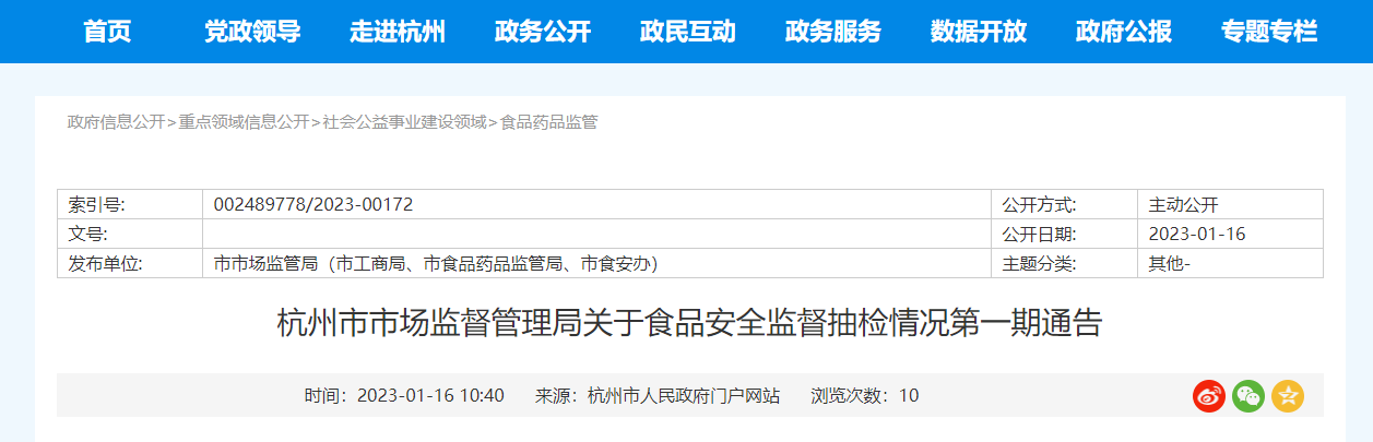 中国质量新闻网讯 据杭州市人民政府网站2023年1月16日消息,近期,杭州市市场监督管理局对食品生产环节、流通环节、餐饮服务环节的食品进行了监督抽检。
