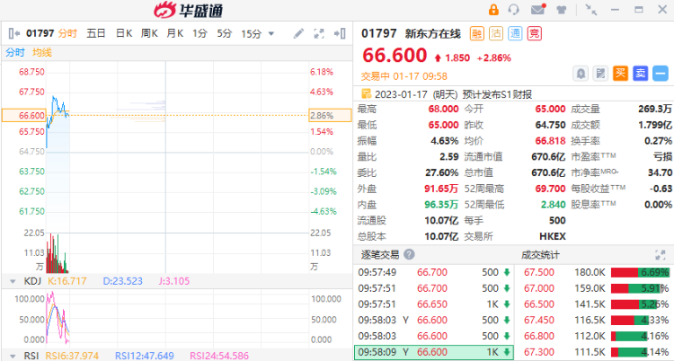 新东方在线(01797)今日将披露出圈后首份半年报。该股早盘一度涨超4%,截至发稿,涨2.86%,报66.6港元,成交额1.79亿港元。