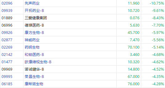 华盛资讯1月17日消息,港股医药股板块下挫,截至发稿,先声药业跌超10%,开拓药业-B跌超9%;药明生物、神威药业跌超5%,荣昌生物-B、康希诺生物等跌幅居前。