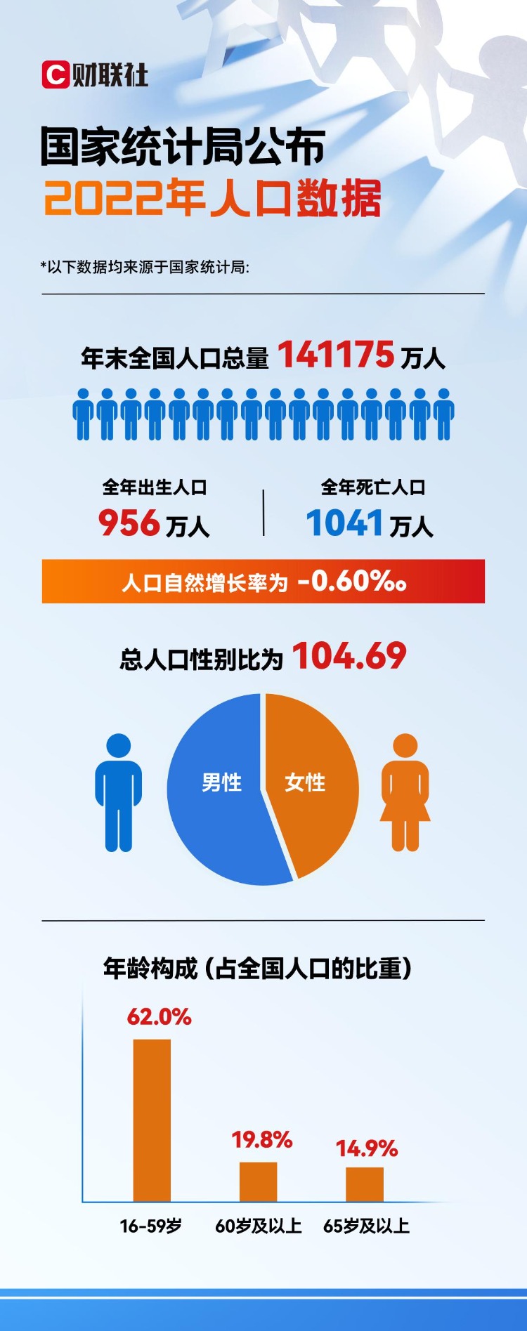 国家统计局17日发布2022年全年经济数据。2022年末人口总量有所减少;人口自然增长率为-0.60‰;从性别构成看,男性人口72206万人,女性人口68969万人,总人口性别比为104.69(以女性为100)。