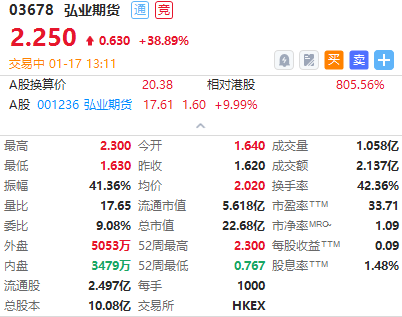 弘业期货(03678)午后继续走高,现涨超38%,报2.25港元。同时,公司A股连续三日涨停。近期,南下资金持续买入弘业期货,目前持仓占比增加至25%。公司是首家“A+H”期货公司,实控人为江苏国资委。