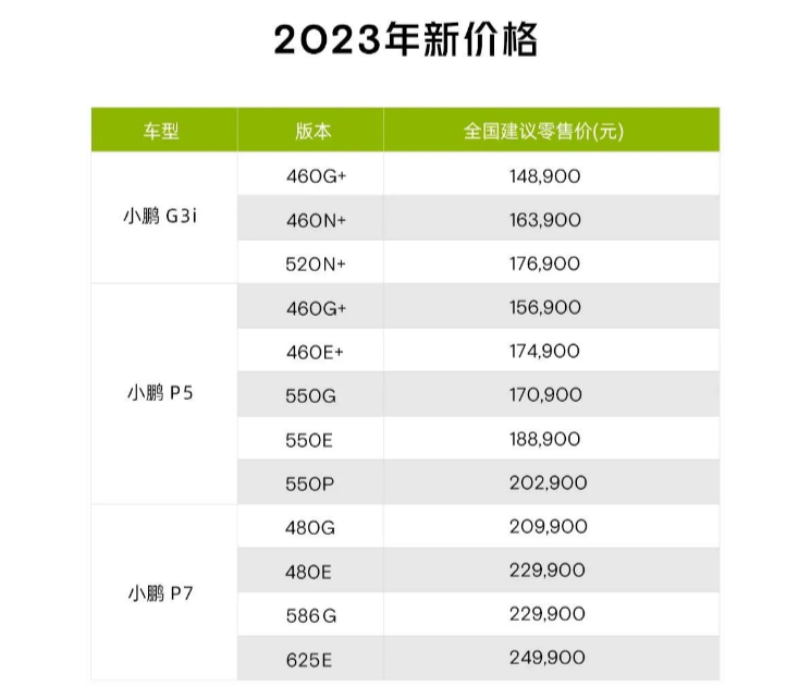 2023年春节倒计时4天,小鹏汽车官宣将启动新春售价。公告称,自2023年1月17日14:00起,小鹏汽车将启动G3i/P5/P7的新年新价格体系。同时,在此公告发布前一年内订购G3i/P5/P7的首任车主,将同步给予新春回馈。其中小鹏P5售价从17.99-22.59万元降至15.69-20.29万元;小鹏P7售价从23.99-28.59万元降至20.99-24.99万元;小鹏G3i售价从16.89-20.19万元降至14.89-17.69万元。整车质保:整车质保延长至10年/20万公里首任车主置换本品新车时,可再次享受同等质保。车辆保养:赠送4年基础保养。