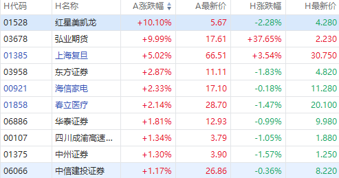 截至发稿,红星美凯龙A股涨停,H股现跌超2%;弘业期货A股连续三日涨停,H股涨超37%;上海复旦A股涨超5%,H股涨超3%。