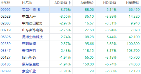 荣昌生物-B A股跌超3%,H股跌超5%;中国人寿A股跌超3%,H股跌超3%;中海油田服务A股跌超2%,H股跌超3%。