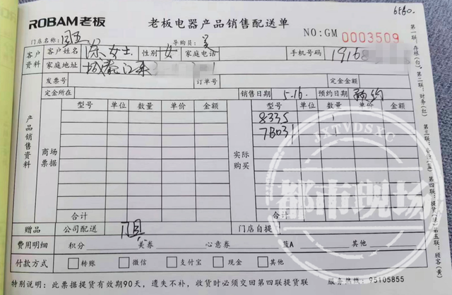 涂女士告诉记者,她是2021年5月份,在国美电器广场南路店购买了“老板”牌的一个灶台和一台抽油烟机,11月份又买了同一品牌的一台蒸烤箱,总共花了一万三千多块钱。不过,她当时并没有直接提货。