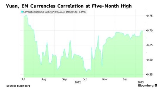 人民币与新兴市场货币之间的60天相关性指数已升至0.70,为五个月来的最高水平。重新开放对泰国泰铢和韩圆来说尤其有利可图,这两种货币都是中国旅游业的受益者。随着中国对铜的需求不断上升,智利比索也将走高。