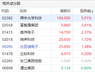 华盛资讯1月18日消息,隔夜苹果发布新品,今日港股苹果概念股走高,舜宇光学科技(02382)涨5.01%,高伟电子(01415)涨2.37%,比亚迪电子(00285)涨1.38%,瑞声科技(02018)涨1.72%。