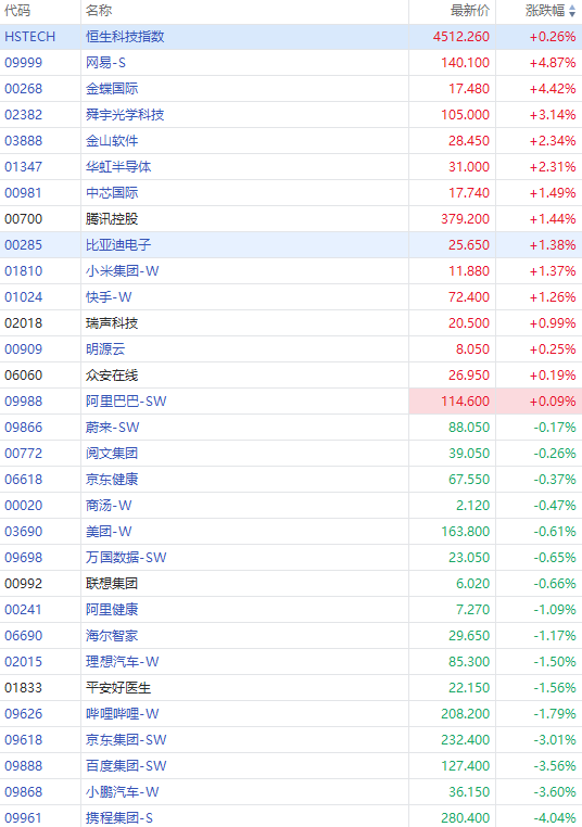 科网股涨跌互现,小米、快手涨超1%,阿里巴巴涨0.09%,美团跌0.61%,京东和百度跌超3%。