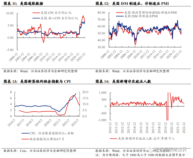 美国通胀数据继续回落趋势不变、经济衰退压力加大背景下,美国长端利率1季度有望确立见顶并震荡回落,美股从“杀估值”进入到“杀盈利”的磨底阶段。1)美国2022年12月消费者价格指数(CPI)环比下降0.1%,同比上涨6.5%,CPI同比增速自2022年中达到峰值以来连续六个月下降。2)美国12月ISM制造业PMI为48.4,创2020年5月以来新低;非制造业PMI为49.6,大幅低于预期值55.0和前值56.5,为2020年5月以来首次低于荣枯线。