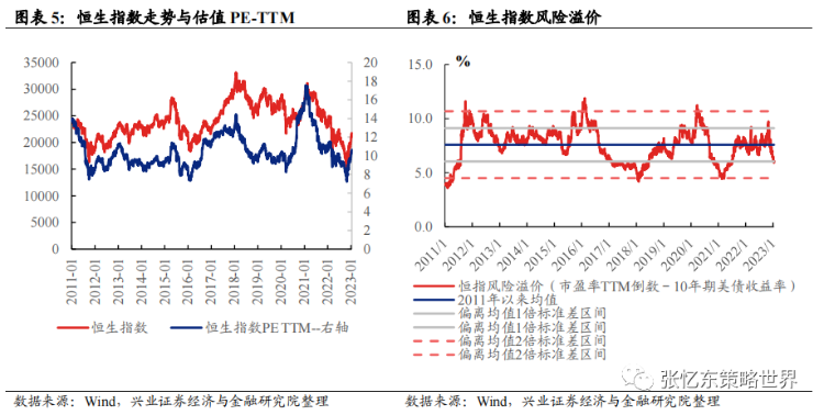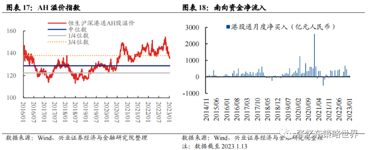 1)2022年11月以来,在经历了过去两年最冷的寒冬后,港股风险偏好改善明显,风险溢价由9.7%下降至5.9%,已经处于2011年以来的19.9%分位数水平。但估值仍处于历史中枢下方,截至1月13日,恒生指数PE-TTM自低点的7.2倍提升至10.6倍,处于2016年以来的49.3%分位数水平。下阶段,海外美债长端利率进一步下行有望继续推动估值修复,随着中国疫情高峰过去、稳增长政策发力,港股基本面也将迎来边际改善,走出2022年低谷。