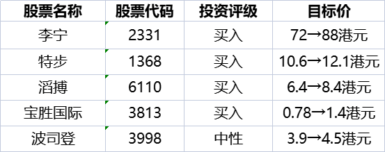 考虑到2022年第4季度,尤其是12月的销售低迷,该行将运动服饰业的2022年预期收益下调6-68%,并微调2023-24年的收益预期,以反映对复苏前景的看好。该行上调投资者情绪改善、全球品牌重新评级的估值倍数,以反映对其前景稳健增长的预期。故目标价提升15-79%。