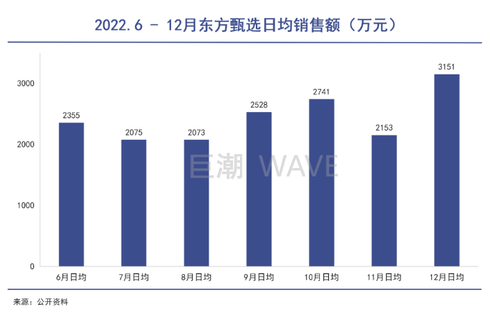 有了粉丝基础后,东方甄选很快扩展品类,将商品种类从农产品扩展到了图书音像、食品饮料、生鲜蔬果、美妆日用品、酒水和旅游产品等领域,并打造了6个矩阵号。而从带货数据来看,2022年6-12月东方甄选日均GMV 2416.1万元,所有账号累计带货GMV则为59.37亿元。