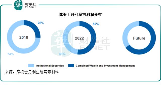 见下图,在2010年时,摩根士丹利更专注于机构证券(浅蓝色),财富和投资管理业务(深蓝色)的税前利润的占比只有26%;到2022年,财富和投资管理业务的税前利润占比已达到52%。从下图或可预见,未来大摩还会继续拓展财富和投资管理业务的利润占比,以进一步降低对机构证券业务的依赖。