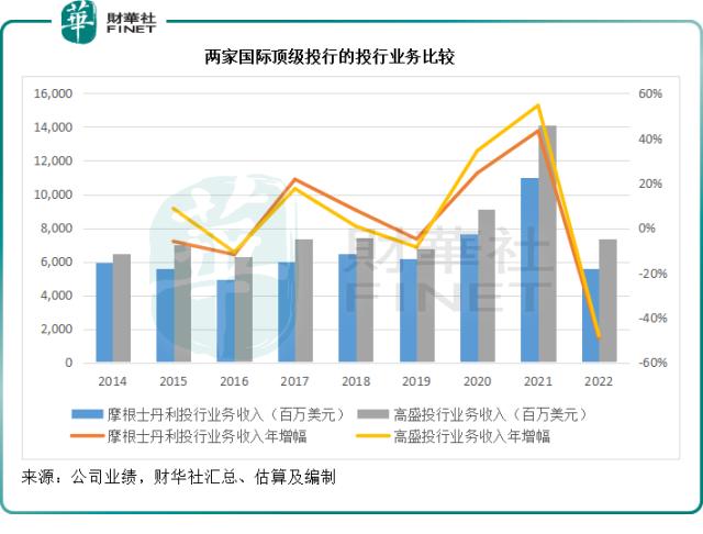 这是因为高盛更专注于投行业务。见下图,对比于摩根士丹利,高盛的投行业务收入规模一直占据主要优势。