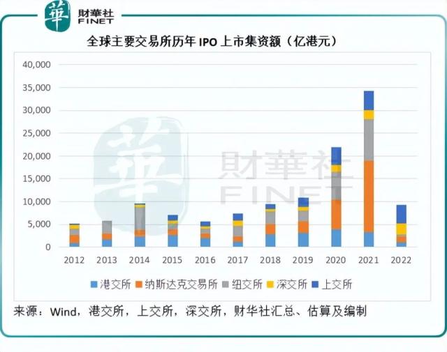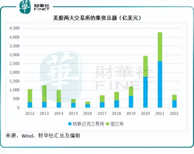 Wind的数据显示,纳斯达克交易所的2022年总集资额只有406亿美元,按年下滑84.56%;纽交所的总集资额同比下滑80%,至327亿美元,见下表。