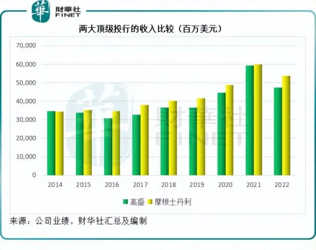 见下图,从收入规模来看,除了2014年和2021年之外,摩根士丹利的收入规模要显著大于高盛。